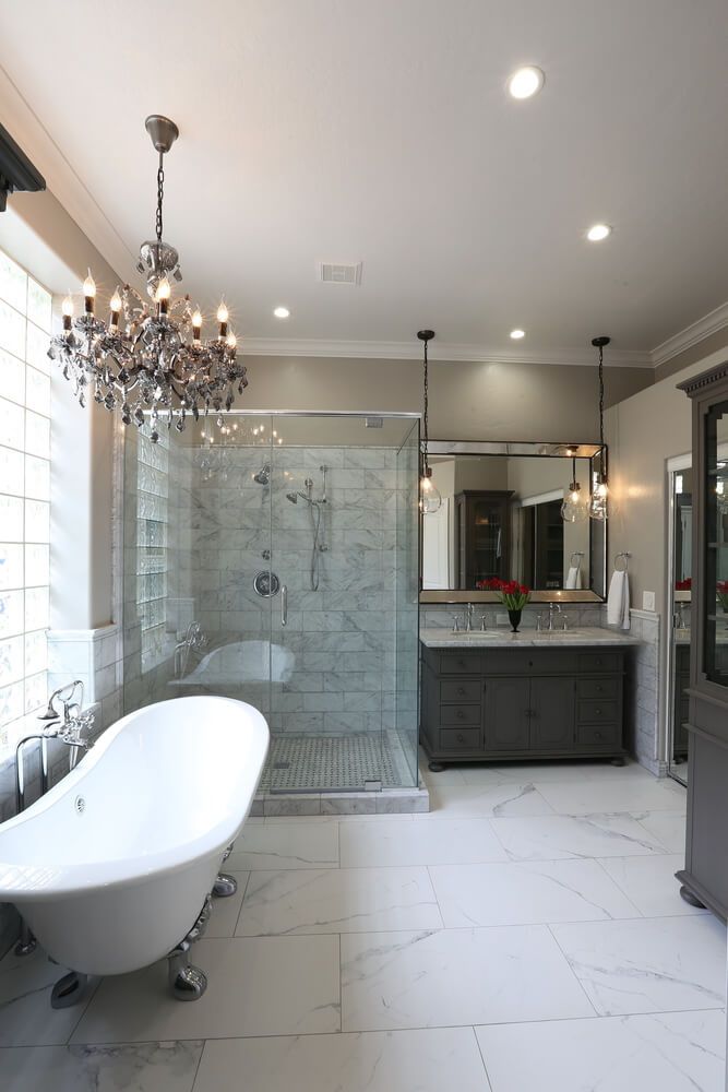 For a more traditional aesthetic in your master bathroom go for a clawfoot tub and a separate shower. A clawfoot tub is a classic design that never goes out of style and can add a touch of elegance to any bathroom. These types of bathrooms typically feature a built-in double vanity with two sinks.