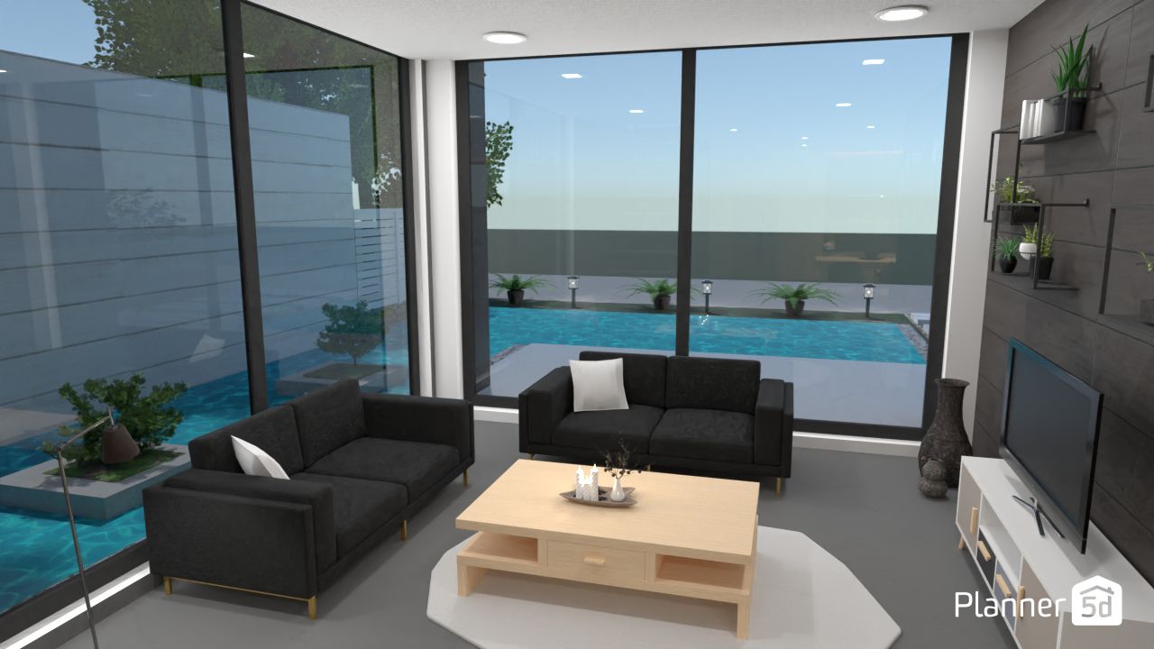 Looking around more of a beautiful clean home, we notice a small but spacious living room with huge windows and a view into the pool and outside. The living room is furnished with a couple of simple sofas, a low-profile TV stand and a modern lamp.