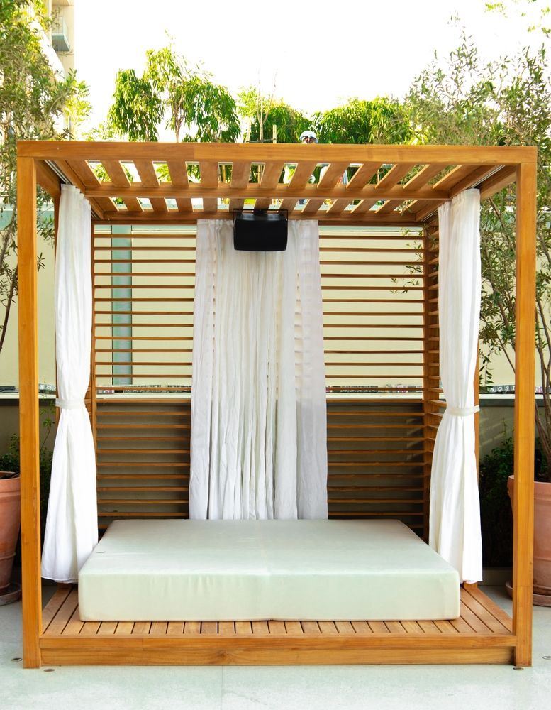 Cabanas usually have floor-to-ceiling curtains or panels on three sides while the front faces the swimming pool. Hanging lanterns and elegant furniture with comfortable pillows and mattresses add a tropical touch to your cabana. Add a bar, sink, outdoor grill and potted plants to recreate that luxurious resort vibe to rest and unwind.