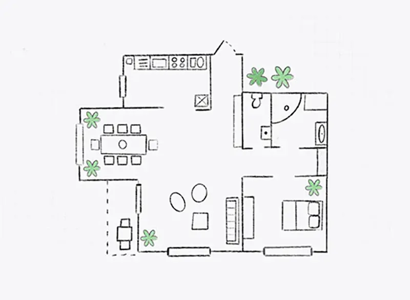 It ensures effective room division, sufficient storage, and countertop workspace, as well as short & direct routes. For example, there is a rule stating that you shouldn’t put an island where it would get in the way. Instead, you can put the sink and refrigerator on the same wall and the cooktop opposite.