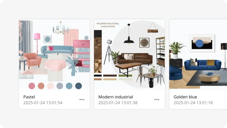 A mood board for interior design includes textures and materials like fabric swatches, paint colours, flooring options and even specific lighting styles. This helps you visualise how all the design elements will work together in the space. To make it easier Planner 5D’s Moodboards allows you to create an interior design mood board tailored to your vision in minutes. You can arrange your mood board elements to reflect your interior design inspirations, colour scheme, furniture and aesthetics. A detailed interior design mood board ensures your final design stays on track and true to your original idea.