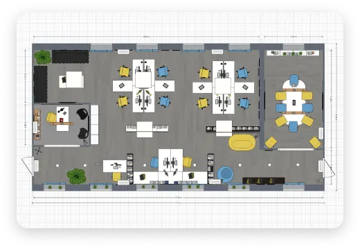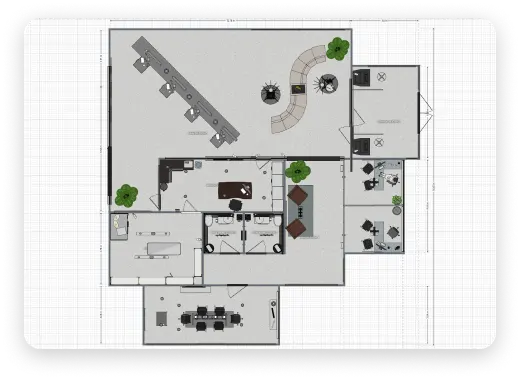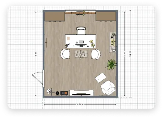 Planner 5D makes creating office layouts a breeze. The user-friendly and intuitive interface, designed for professionals and amateurs alike, lets you design functional and appealing office spaces your employees will love. With an extensive library of items and layouts, you can create everything from commercial offices to home workspaces.